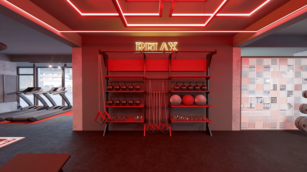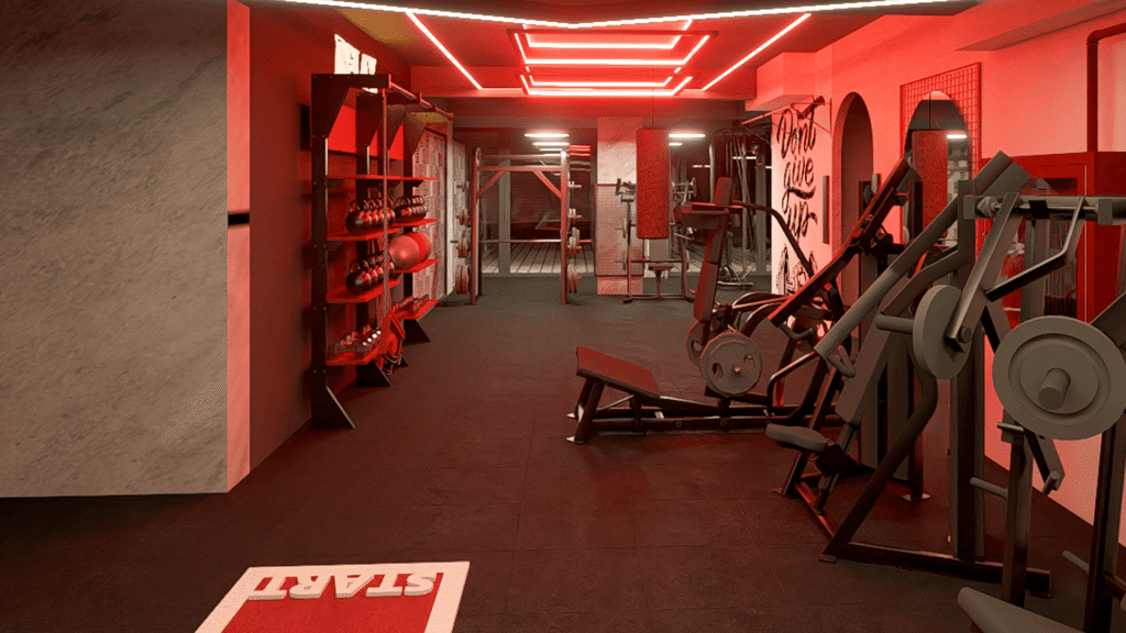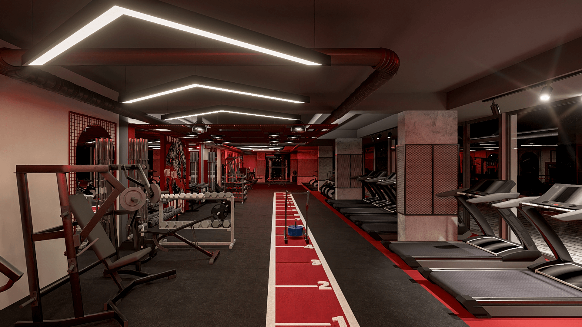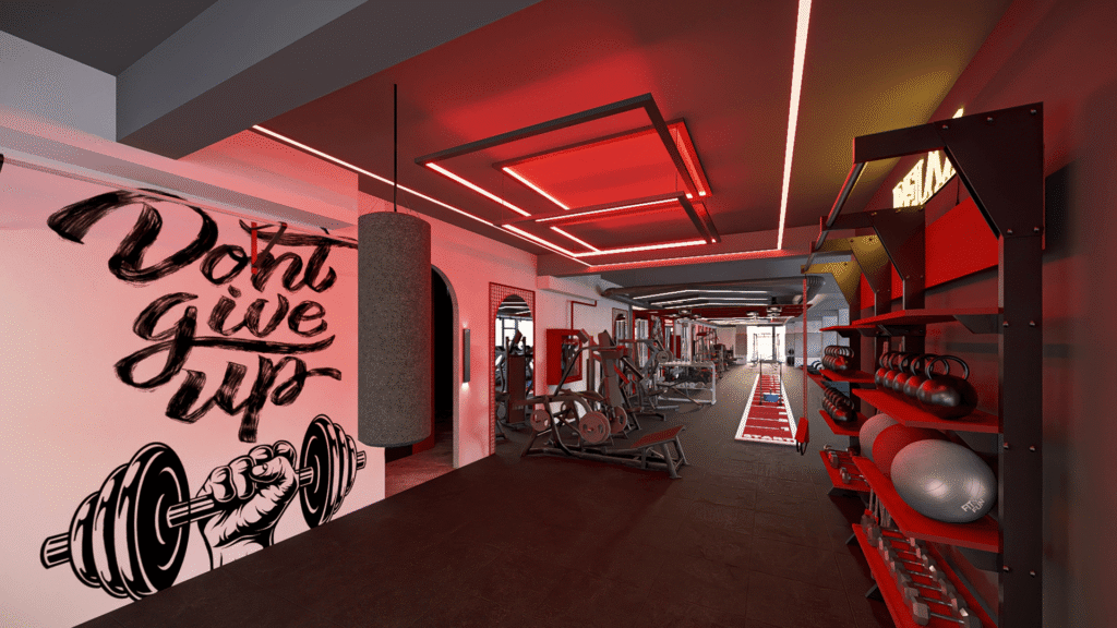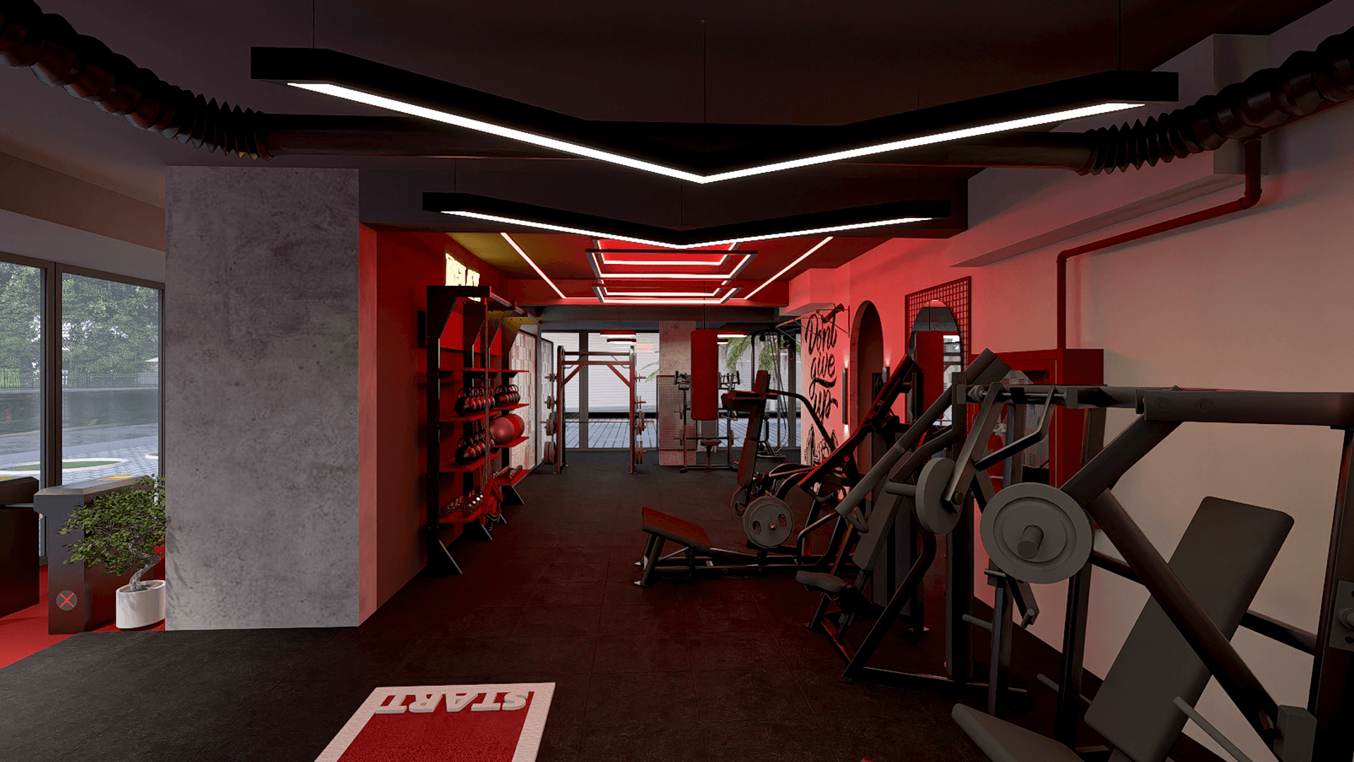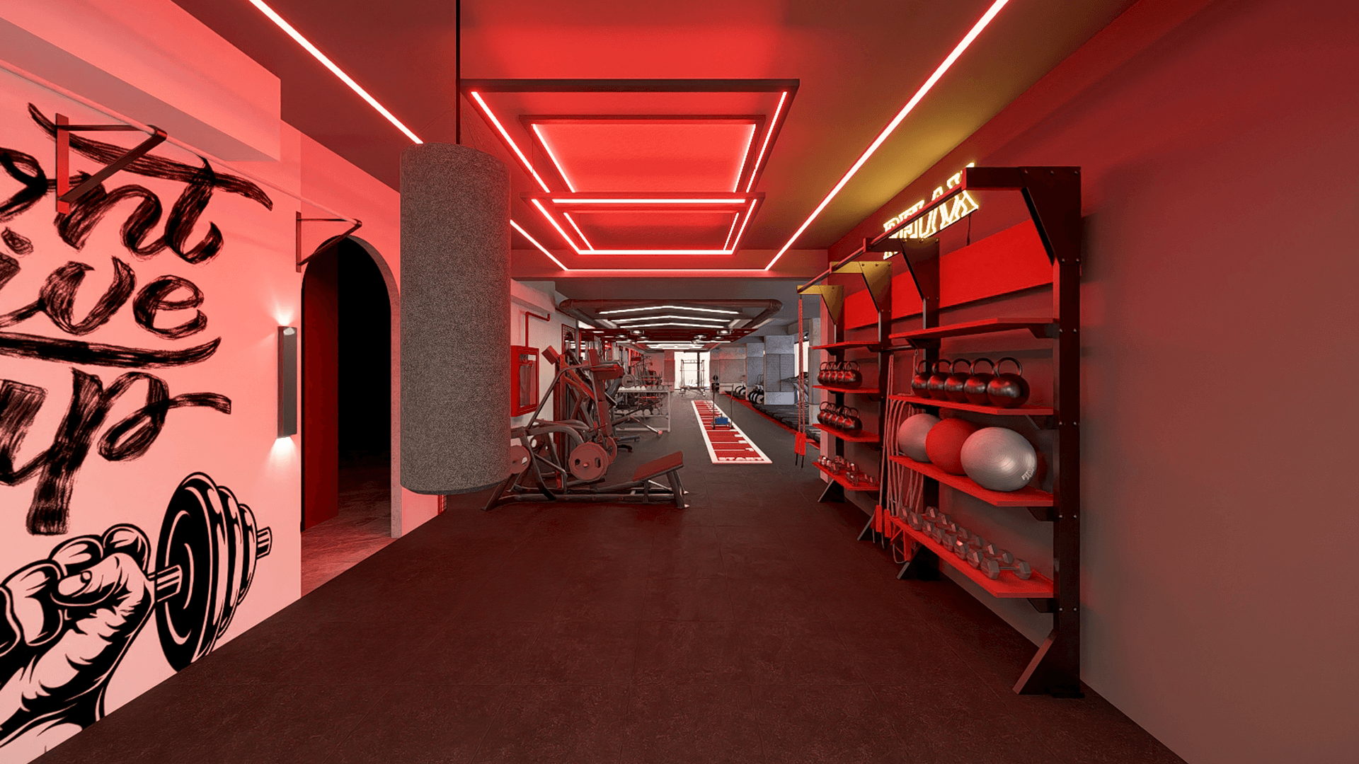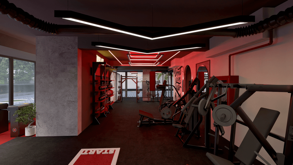 Yüksek performanslı bir fitness deneyimi için dinamik ve fonksiyonel bir iç mekân tasarımı.